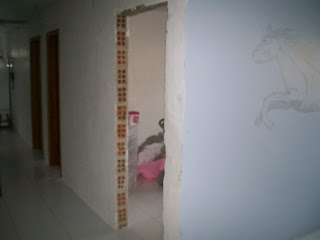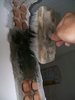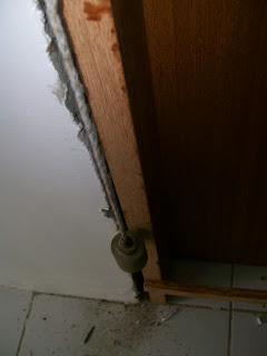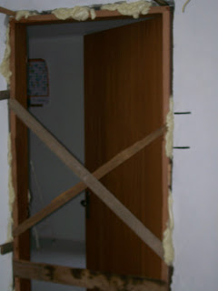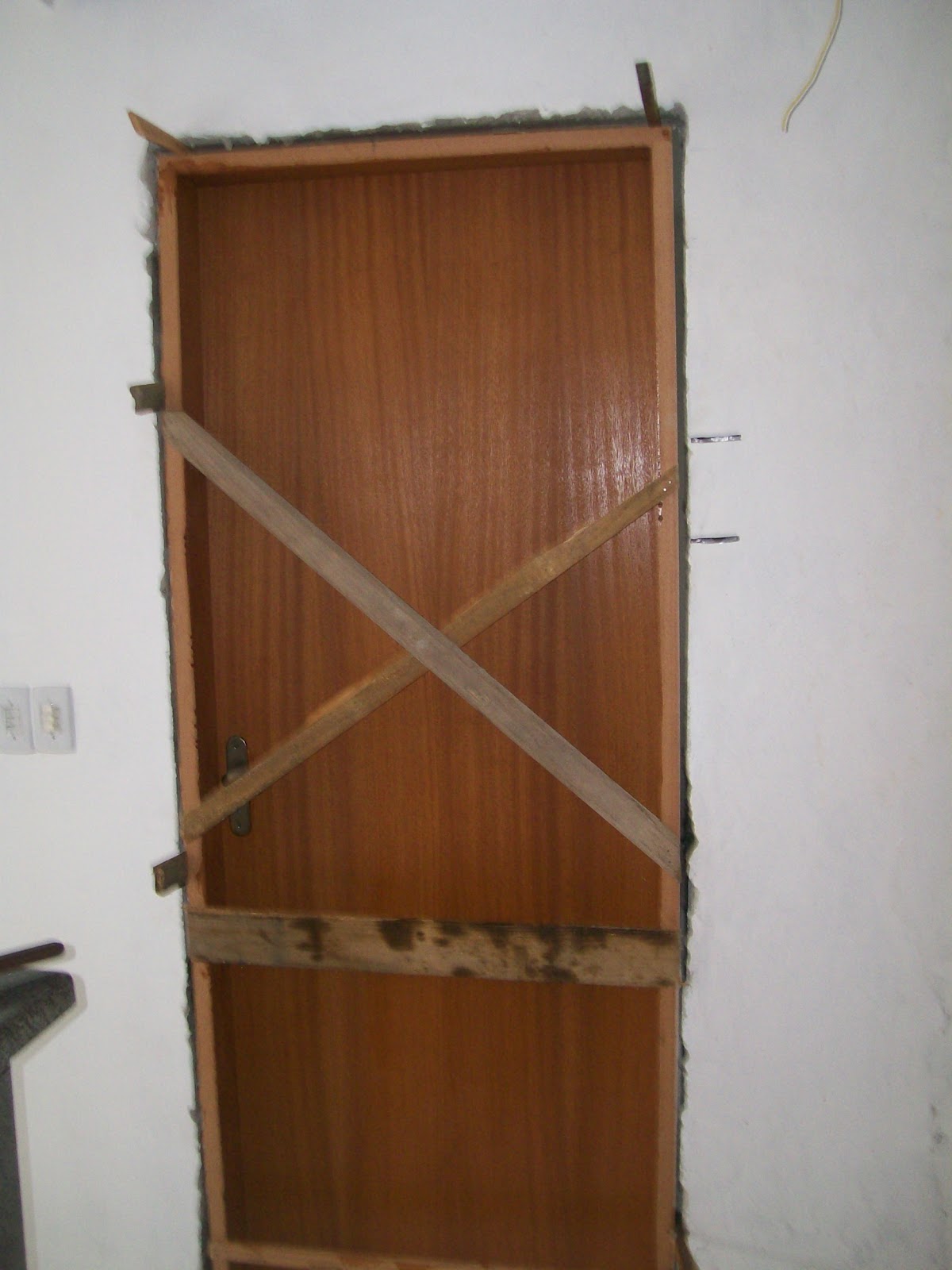 No método antigo tradicional com tacos, devemos abrir buraco onde vai ser colocado o marco da porta e chumbar tacos de madeira. Dá uma trabalheira uma baita sujeira.