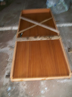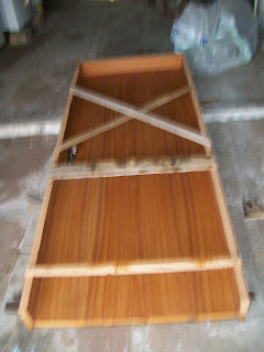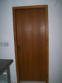 A porta vem montada e travada com uma travessa pregada abaixo, essa travessa impede que ela saia do esquadro, que seria uma tragédia na hora da montagem
